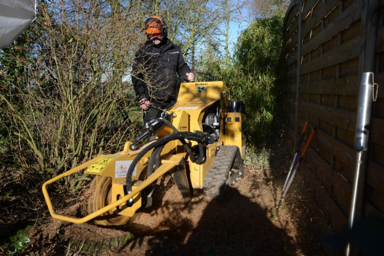 Mit einer Breite von nur 89 cm hat unsere Stubbenfräse einen optimalen Zugang zu Gärten und engen Bereichen, durch den Kettenantrieb ist die Bodenbelastung sehr gering.